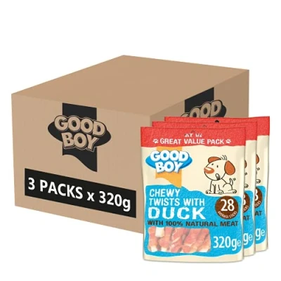 STOCK UP ON DOGGY FAVS: never be without your pup's favourite treat, with our bulk box - contains 3 packs of 320g Good Boy Duck Twist Dog Treats NATURALLY MEATY: made with 100% natural duck breast meat, for that meaty treaty taste LOW FAT TREAT: a healthier snack with only 2% fat makes the perfect guilt free treat for your four-legged friend CHEWY TEXTURE: dogs love to chew and it’s a great way to support healthy teeth, strong jaws and keep boredom at bay