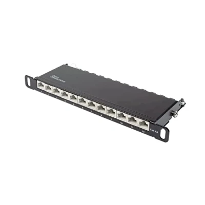 Patch panel / patch panel / distribution panel - 10" / 10" version with 12 ports Cat. 6A / Category 6A - Suitable for 10 Gigabit/s Ethernet and for transmission frequencies up to 500 MHz Shielded (STP) + complete shielding of the RJ45 sockets and the LSA strips + central earthing connection Cable installation via LSA strips (colour coding according to TIA 568 A/B) - for solid and stranded cables (22-26 AWG) Colour: jet black (RAL9005) / dimensions (W x D x H): 254 x 100 x 22 mm