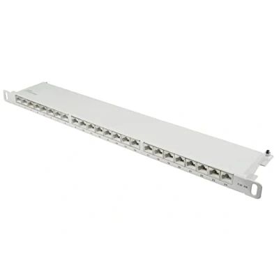 Patch panel / patch panel / distribution panel - 19 inch / 19 inch version with 24 ports Cat. 6A / Category 6A - Suitable for 10 Gigabit/s Ethernet and for transmission frequencies up to 500 MHz. Shielded (STP) + complete shielding of the RJ45 jacks and the LSA strips + central earth connection Cable installation via LSA strips (colour coding according to TIA 568 A/B) - for solid and stranded cables (22-26 AWG) Product colour: Light grey (RAL7035) / Dimensions (WxDxH): 482.6 x 100 x 22 mm