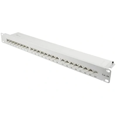 Patch panel / patch panel / distribution panel - 19 inch / 19 inch version with 24 ports Cat. 6A / Category 6A - Suitable for 10 Gigabit/s Ethernet and for transmission frequencies up to 500 MHz Shielded (STP) + complete shielding of RJ45 sockets and LSA strips + central earth connection Cable installation via LSA strips (colour marking according to TIA 568 A/B) - for solid and stranded cables (22-26 AWG) Colour: Light Grey (RAL7035) / Dimensions (WxDxH): 482.6 x 100 x 22 mm