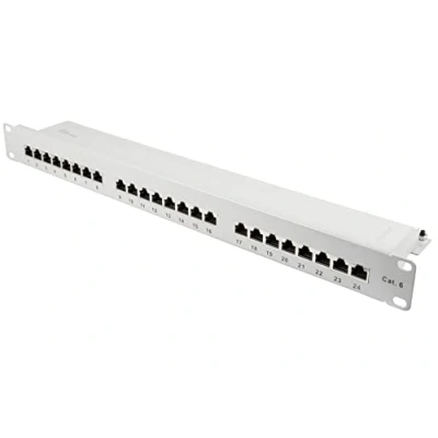 Patch panel / patch panel / distribution panel - 19 inch / 19 inch version with 24 ports Cat. 6 / Category 6 - Suitable for 1 Gigabit/s Ethernet and for transmission frequencies up to 250 MHz. Shielded (STP) + complete shielding of the RJ45 jacks and the LSA strips + central earth connection Cable installation via LSA strips (colour coding according to TIA 568 A/B) - for solid and stranded cables (22-26 AWG) Product colour: Light grey (RAL7035) / Dimensions (WxDxH): 482.6 x 100 x 22 mm