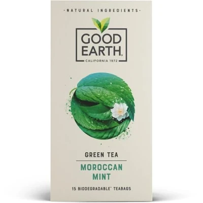 Refreshing Mint Balance – Clean green tea blended with sweet spearmint creates a cooling, aromatic cup that feels light and refreshing, inspired by traditional Moroccan mint tea and designed to transport you with every sip Smooth Green Tea Lift – The gentle caffeine of green tea pairs with mint to provide natural refreshment without harshness, making it a great choice for mornings, afternoons or mindful breaks that need a little lift Aromatic mint flavour – Made with fragrant mint leaves and spearmint to deliver a silky smooth finish and cooling aftertaste, balancing freshness and sweetness without overpowering the delicate green tea base Sunshine in Every Cup – Born in California in 1972, Good Earth has been creating bold, uplifting tea blends ever since, inspired by sunshine, laughter and a love of vibrant flavour that brings energy and optimism to everyday tea moments Crafted with Care for Planet & People – Sustainability sits at the heart of Good Earth, using plant-based compostable teabags, recyclable cartons, Rainforest Alliance ingredients and donating 1 percent of profits to environmental causes
