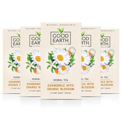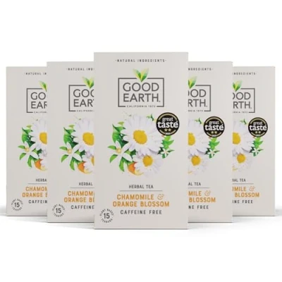 Naturally Calming Flavour – A smooth chamomile tea layered with soft floral orange blossom, creating a gentle and comforting cup that helps you slow down and savour a quiet moment, perfect for evenings or when you need a mindful pause Caffeine Free Herbal Unwind – Naturally caffeine free chamomile tea bags designed for relaxation without drowsiness, ideal for winding down at night or enjoying throughout the day without disrupting sleep or energy levels Bright Botanical Ingredients – Made with carefully selected chamomile blended with fragrant orange blossom to deliver a balanced, elegant flavour that feels light, refined and naturally soothing in every cup Sunshine in Every Cup – Born in California in 1972, Good Earth has been creating bold, uplifting tea blends ever since, inspired by sunshine, laughter and a love of vibrant flavour that brings energy and optimism to everyday tea moments Crafted with Care for Planet & People – Sustainability sits at the heart of Good Earth, using plant-based compostable teabags, recyclable cartons, Rainforest Alliance ingredients and donating 1 percent of profits to environmental causes