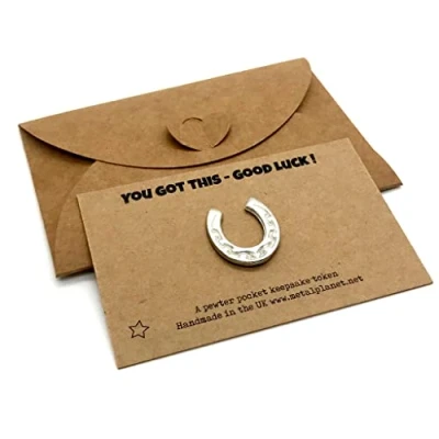 Beautifully packaged little pocket keepsake good luck horseshoe The printed card says 'YOU GOT THIS - GOOD LUCK !' and there is a message area on the reverse to add your own message to the recipient. This cute little metal horseshoe measures around 2cm x 2cm The horseshoe token comes packaged on this lovely printed card (business card size) which is then packaged inside a matching kraft envelope with a little heart clasp. The lucky horseshoe token can be removed from the card and kept in a pocket, wallet, special place etc! Lightweight and perfect for so many occasions where a little extra luck is needed! Designed and handmade in the UK at our Hertfordshire studios.