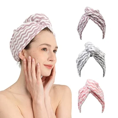 【Super Absorbent Soft Microfiber Hair Towel】 The microfiber fabric is super soft, lightweight and skin-friendly, with no linting, making towels safer and healthier, and the slim fabric creates enough gaps to increase the contact area with the hair, making the hair cap with super water-absorbent. 【Take Care of Your Hair】 Hair dryers tend to lose moisture and oil in the hair, resulting in split ends and frizzy hair. Use a hair towel wrap first to absorb most of the moisture, then use the hair dryer to dry your hair to anti frizz and reduces damage to your hair, make your hair’s texture will be more smoother and shinier. 【Easy to Use】 The size of the microfibre towel hair is 65 x 25 cm and with elastic band & solid button, much easier than a towel to balance on top of your head, and easily contains all of your hair, and keep fixing on your head, suitable for all long, short, curly and straight hair types for any crowd, adult and kids. 【Save Your Daily Time】 When you have washed your hair, the hair towel turban can make your hair-no drips, no soaking, keep your wet hair out of your face and off your back. it is a great partner in facial, bath, makeup, face Wash, working etc., making you have more time to do what you like without the hassle of wet hair! 【1 Pack with 3 Colors】 Lovely soft hair wrap towel with 3 colors for you, Gray, Purple, Pink, You can share with your friends and family or use a different colour each time and the towel is light enough to take with you to the gym, pool party or hotel.