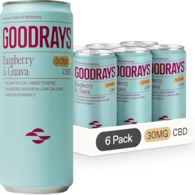 HIGH CBD CONTENT - Delicious and refreshing all-natural drinks, infused with 30mg of premium, high strength CBD. All GOODRAYS products are sustainably sourced, independently tested for quality and safety, and contain 0% THC. NO ADDED SUGAR, NO ARTIFICIAL SWEETENERS, AND LOW CALORIE - Our range of CBD drinks are free from nasties and contain only 33 calories per can. HIGH IN VITAMIN D - Each can contains your daily dose of Vitamin D. 100% VEGAN - Plant-based and sun-grown CBD drinks. 4 DELICIOUS FLAVOURS - Our CBD drinks come in 4 delicious flavours, and are available in either single or mixed pack format. Blood Orange & Grapefruit, Raspberry & Guava, Elderflower & Yuzu, and Passionfruit & Pomelo. Also available in 6 pack, 12 pack, and 24 pack formats. PACKAGING MAY VARY - For a limited period of time.