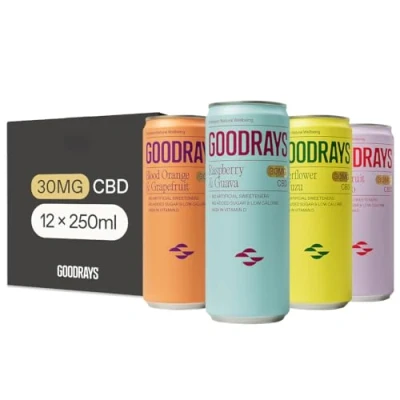 HIGH CBD CONTENT - Delicious and refreshing all-natural drinks, infused with 30mg of premium, high strength CBD. All GOODRAYS products are sustainably sourced, independently tested for quality and safety, and contain 0% THC. NO ADDED SUGAR, NO ARTIFICIAL SWEETENERS, AND LOW CALORIE - Our range of CBD drinks are free from nasties and contain only 33 calories per can. HIGH IN VITAMIN D - Each can contains your daily dose of Vitamin D. 100% VEGAN - Plant-based and sun-grown CBD drinks. 4 DELICIOUS FLAVOURS - Our CBD drinks come in 4 delicious flavours, and are available in either single or mixed pack format. Blood Orange & Grapefruit, Raspberry & Guava, Elderflower & Yuzu, and Passionfruit & Pomelo. Also available in 6 pack, 12 pack, and 24 pack formats. PACKAGING MAY VARY - For a limited period of time.