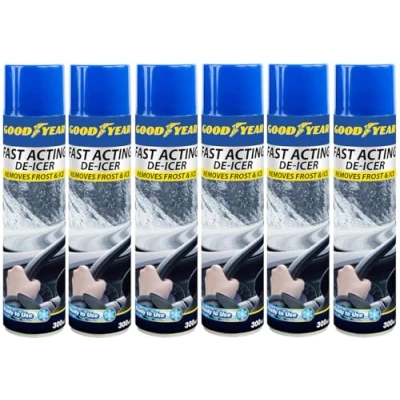 Goodyear Fast Acting De-Icer 6 pack Specially formulated to remove frost and ice quickly from glass, windscreen, locks. Ready to use formula, simply spray and watch frost and ice magically disappear pH neutral formula ensure your car paint and bodywork aren’t damaged Each can is 300ML in size, be prepared for winter