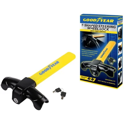 Ultimate Vehicle Protection:This high-security anti-theft device provides robust protection against theft, its best for car security devices. Goodyear T-Shape Steering Wheel Lock is designed to fit most steering wheels, providing versatile security for a wide range of vehicles. Whether you drive a car, SUV, or truck. Durable Construction for Long-Lasting Use: Made with high-quality materials, the Goodyear T-Shape Steering Wheel Lock is built to withstand wear and tear. Its durable construction ensures long-lasting use, giving you peace of mind and consistent protection over time. High-Visibility Yellow for Deterrence: The bright yellow color of the steering wheel lock serves as a visual deterrent, signaling to potential thieves that your vehicle is well-protected. This high-visibility feature helps prevent theft before it even starts. Universal Fit for Cars, SUVs, and Trucks: The Goodyear T-Shape Steering Wheel Lock is designed to fit most steering wheels, providing versatile security for a wide range of vehicles. Whether you drive a car, SUV, or truck, this lock ensures a snug fit for maximum protection. Easy to Use and Install: Installing the Goodyear T-Shape Steering Wheel Lock is quick and effortless. Its user-friendly design lock allows for easy attachment and removal, making it convenient for everyday use. Secure your vehicle in seconds with minimal effort.