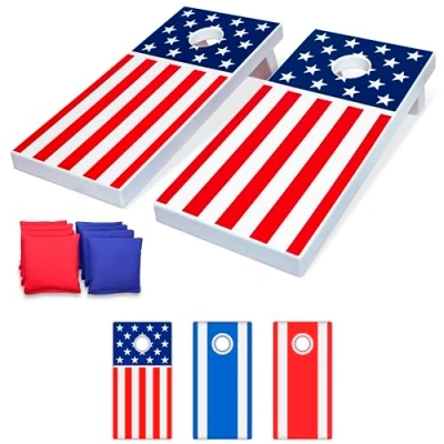 ALL-WEATHER CORNHOLE BOARDS: Includes 2 ultra sturdy 4 feet x 2 feet all-weather cornhole boards, 8 all weather regulation size and weight bean bags with game rules for fun with friends and family PATRIOTIC FUN: Add to the fun with this American Flag inspired design; optimal for holiday weekends, cookouts, tailgating and more SOCIAL EVENT FAVORITE: Hours of bean bag tossing fun with friends and family at tournaments, tailgates, cookouts, campsites, and more FAMILY PROOF: Ultra durable kid-proof plastic built to withstand family playtime and more ALL-WEATHER BEAN BAGS: Includes 8 regulation 16 oz all-weather bags (4 red and 4 blue) that can conveniently be placed between the boards when storing