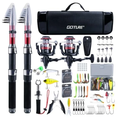Goture Fishing Rod and Reel Combos, 2Pcs Telescopic + Pre Loaded Spinning Reels with Carrier Bag, 2.0 Gear Pole Kit for Starter Saltwater Freshwater 2.4M