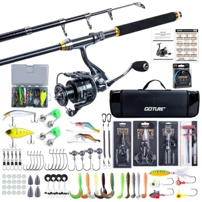 Fishing Kit with Carrier Bag: This versatile fishing combo set includes everything you need for a successful fishing experience. The package contains a telescopic fishing rod, a spinning reel, a 150M fishing line, 2pcs fishing bite alarm, a fishing pliers, a fish gripper, a fishing line cutter, 2pcs fishing landyard, a hook removal, a tackle box with a variety of fishing lures, spoons, fishing hooks, and some necessary fishing equipment and a convenient carrier bag Lightweight Telescopic Fishing Rod: The telescoping rod is built of carbon fiber, which is lightweight, strong, and sturdy. This fishing rod uses stainless steel guides and ceramic rings, which minimize line friction and can deliver longer smooth casts. The high-density EVA handle adopts an ergonomic design to make it comfortable and non-slip Super Smooth Spinning Reel: Aluminum alloy spool is smooth to protect the fishing line from breaking and deformation. The 5.2:1 gear ratio gives the fishing reel ultra-smooth performance. Interchangeable right or left CNC machined aluminum handle and EVA knob, sturdy and long-lasting. Its high strength makes further casting. It is the great all-around spinning reel for every angler Essential Fishing Accessories: This set includes an aluminium and stainless steel fish hook remover for safe and quick unhooking, and practical tools such as sharp line scissors, a multi-function lure plier for hook removal and split rings, plus a stainless steel fish gripper with double handles for a stronger hold, 2pcs fishing landyard to prevent items from accidentally falling Grab and Go: The fishing rod and reel set comes with a waterproof carrying bag, making it easy to carry your fishing rod and all other accessories and protecting them from damage. You can fish anywhere, and it's easy to carry! With this fishing set, you don't need to buy any other fishing equipment