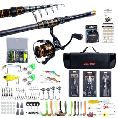 Fishing Kit with Carrier Bag: This versatile fishing combo set includes everything you need for a successful fishing experience. The package contains a telescopic fishing rod, a spinning reel, a 150M fishing line, 2pcs fishing bite alarm, fishing pliers, a fish gripper, a fishing line cutter, a tackle box with a variety of fishing lures, spoons, fishing hooks, and some necessary fishing equipment and a convenient carrier bag Lightweight Telescopic Fishing Rod: The telescoping rod is built of carbon fiber, which is lightweight, strong, and sturdy. This fishing rod uses stainless steel guides and ceramic rings, which minimize line friction and can deliver longer smooth casts. The high-density EVA handle adopts an ergonomic design to make it comfortable and non-slip Super Smooth Spinning Reel: Aluminum alloy spool is smooth to protect the fishing line from breaking and deformation. The 5.2:1 gear ratio gives the fishing reel ultra-smooth performance. Interchangeable right or left CNC machined aluminum handle and EVA knob, sturdy and long-lasting. Its high strength makes further casting. It is the great all-around spinning reel for every angler Essential Accessories: The uniquely shaped scissors offer sharp, precise cutting for standard fishing lines. The multi-functional lure pliers are perfect for hook removal, opening split rings, and cutting line. The fish gripper features dual handle loops for a stronger grip, with a stainless steel jaw for long-lasting durability Grab and Go: The fishing rod and reel set comes with a waterproof carrying bag, making it easy to carry your fishing rod and all other accessories and protecting them from damage. You can fish anywhere, and it's easy to carry! With this fishing set, you don't need to buy any other fishing equipment