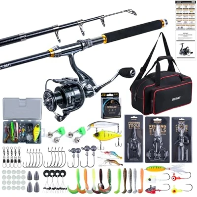 Fishing Kit with Carrier Bag: This versatile fishing combo set includes everything you need for a successful fishing experience. The package contains a telescopic fishing rod, a spinning reel, a 150M fishing line, 2pcs fishing bite alarm, a fishing pliers, a fish gripper, a fishing line cutter, a tackle box with a variety of fishing lures, spoons, fishing hooks, and some necessary fishing equipment and a convenient carrier bag Lightweight Telescopic Fishing Rod: The telescoping rod is built of carbon fiber, which is lightweight, strong, and sturdy. This fishing rod uses stainless steel guides and ceramic rings, which minimize line friction and can deliver longer smooth casts. The high-density EVA handle adopts an ergonomic design to make it comfortable and non-slip Super Smooth Spinning Reel: Aluminum alloy spool is smooth to protect the fishing line from breaking and deformation. The 5.2:1 gear ratio gives the fishing reel ultra-smooth performance. Interchangeable right or left CNC machined aluminum handle and EVA knob, sturdy and long-lasting. Its high strength makes further casting. It is the great all-around spinning reel for every angler Essential Accessories: The uniquely shaped scissors offer sharp, precise cutting for standard fishing lines. The multi-functional lure pliers are perfect for hook removal, opening split rings, and cutting line. The fish gripper features dual handle loops for a stronger grip, with a stainless steel jaw for long-lasting durability. The night fishing pole bite bait are coupled together by springs that are nailed securely and will not fall off Ready for Any Fishing Trip: Includes a tough 900D Oxford carry bag with both hand and shoulder carry options. The padded handle reduces hand strain, while the multi-compartment interior keeps your gear organised and secure—ideal for anglers on the go