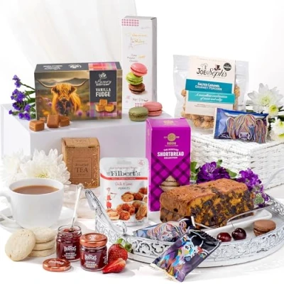 Luxury English Tea Gift Set - A premium English tea gift set featuring English Breakfast Tea, Macarons de Pauline, Joe & Seph’s popcorn, Genoa fruit cake, Mr Filbert’s mixed nuts, Reid’s shortbread, Gardiners of Scotland Highland Cow fudge, Dean’s Steven Brown shortbread, and Mrs Bridges strawberry preserve — an indulgent afternoon tea hamper for 2 Luxury Food Hamper - This beautifully curated selection brings together high-quality treats in one elegant box, offering outstanding value. A versatile choice for hampers & gourmet gifts, perfect as a family hamper, food hampers for couples, or a thoughtful thank you hamper Perfect for Food Lovers - Designed for sharing, this balanced mix of sweet and savoury treats works as a savory snack hamper, cream tea hamper, or indulgent treat hamper — ideal for birthdays, celebrations, or as birthday hampers for men and birthday gifts for mum Beautifully Presented & Alcohol-Free - Arriving in an attractive magnetic box, this alcohol free hamper is ready to give with no extra wrapping needed. A stress-free gifting option for gifts for grandparents, anniversaries, get-well wishes, or any meaningful occasion Gift with Confidence - Crafted with trusted brands and premium products, this gourmet hamper delivers flavour, presentation, and reliability. A memorable gift experience designed to delight recipients and make your gifting feel thoughtful, generous, and effortless