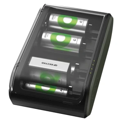 Charge different batteries at the same time? No problem! The compact universal charger from GP supports fast charging of the standard, 5 different battery types (AA, AAA, C, D, 9V block). The robust cassette design doubles as a container in which the batteries can be safely stored. The charger is charged via a USB connection and has intelligent, technical functions. So the progress of charging can be tracked via the LED display. The LED indicator also warns if disposable batteries or defective batteries have been accidentally inserted. Other safety features include automatic power off and detection of fully charged batteries that help prevent overcharging. In addition, the charger is protected against overvoltage and short circuit to ensure the optimal battery life. Safety: timer protection - 14 hours // -dv full charge detection // temperature interruption // primary battery protection // reverse polarity protection 4 LED indicators: green LED lights up 0.5 seconds after connection via USB. While charging: green LED flashes slowly. Fully charged: green LED lights up. Defective batteries or disposable batteries inserted: red LED flashes quickly Technical Specifications – Universal Charger B631: Dimensions: 155 (L) x 90 (W) x 51.5 (H) mm // Weight: ~220g // Number of charging bays/channels: 6/4 Charging time (input DC 5.0V 2.0A min., 2 batteries): AA battery (1300mAh - 2600mAh) - approx. 240-480 min. // AAA battery (650 mAh - 950 mAh) - approx. 150-240 min. // C battery (3000 mAh) - approx. 360 min. D battery (3000 mAh) - approx. 360 min. // 9 V block battery (200 mAh) - approx. 360 - 720 min (1/2 channels) Output voltage/charging current: DC 2.8 V / 290 mA for 1-2 AAA batteries // D.C. 2.8 V / 370 mA for 1-2 AA batteries // D.C. 2.8 V / 550 mA for 1-2 pieces C/D batteries // D.C. 2.8 V / 40 mA for 1 x 9 V battery // DC 2.8 V / 20 mA for 2 x 9 V batteries // USB input power: DC 5 V / 2 A Box contents: 1 x GP B631 USB universal charger, 1 x USB charging cable (batteries not included)