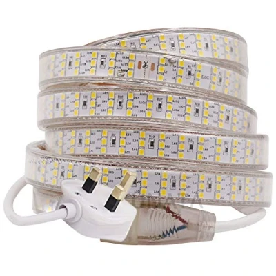 【Super Bright】- (276 LEDs/m) High intensity and reliability SMD 28335 LED Lights 【Mains Powered】- (AC 220V to 240V powered) 80cm UK plug cable, just plug in and work 【Felixble & Cuttable】- Every 1 meter strip can work independently, you can shorten the strip as the length in need. There is a space mark at every 1m strip 【IP65 Waterproof】- Thicker clear PVC tube profile for protect strip. But beware! Both ends as well as the wiring must be inside or protected! It can't be underwater 【Safe and Widely Usage】- Safety fused plug for over current protection. 【NO Self-adhesive tape】Can be 【install by clips】and screws. Suitable for indoor use and also for outdoor use ( living room, kitchen, under cabinet, dining room, bedroom, party, stair, wedding, bar, etc)