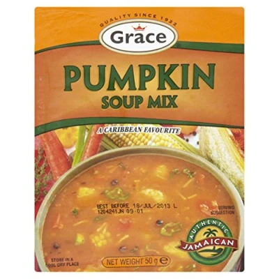 Pumpkin soup mix Authentic Jamaican Contains wheat, soy & celery May contain traces of fish and milk A Caribbean favourite