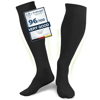 ✅ MADE IN EUROPE – Crafted in the picturesque hills of Slovenia, these compression socks seamlessly combine advanced technology with exceptional European craftsmanship. ✅ SILVERLINE SILVER THREAD TECHNOLOGY – Enriched with silver ions, these knee-high support socks boast antibacterial properties, making them ideal for combating odours and ensuring long-lasting freshness. ✅ GRADUAL COMPRESSION – Featuring a compression level of 15-20mmHg, they support improved blood circulation and promote faster tissue regeneration. ✅ SEAMLESS TECHNOLOGY & HIGH-QUALITY MATERIALS – Designed with seamless technology, these socks eliminate uncomfortable seams, enhance durability, and maximise comfort. Made with 60% organic cotton, certified to the OEKO-TEX Standard 100, they meet eco-friendly and ethical production standards. Breathable and soft, they keep your feet dry and comfortable all day long.