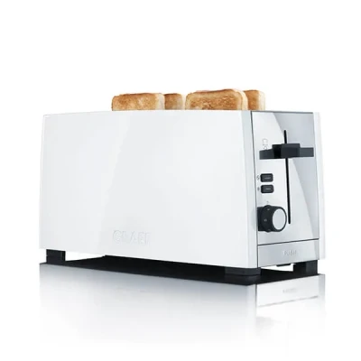 The Graef White 4 Slice Toaster TO100 is the perfect kitchen essential for your breakfast needs. Toasting 4 slices of bread at once, you can control how brown you would like your toast with the knob on the side. Push the lever down to start the toasting, and push the large 'PUSH' button to check on its progress to ensure the best results every time. To ensure you can safely get your toast out, there is an extra-lift to raise your toast higher out of the slots. A safety features that shuts off the toaster if the toast gets jammed ensures that the bread does not burn and thus avoids the risk of potential fires. It has a defrost button to stop frozen bread from turning soggy, and a stainless steel crumb tray that can be removed for easy cleaning. A warming feature will keep your toast warmer for longer if you do not eat it straight away. Measurements: 19 (H) x 15.5 (W) x 38 (D) cm. 2 x Slot size: 13 (H) x 3 (W) x 16 (D) cm, fitting four slices of toast.
