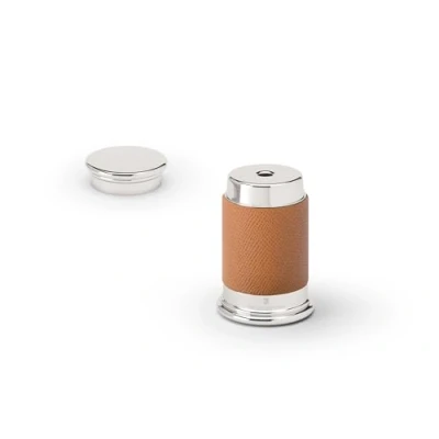 Brown leather circular pen holder Specially selected Italian calfskin leather Highly polished metal base featuring the brand logo Decorative item for the desk Fitted with precision blade