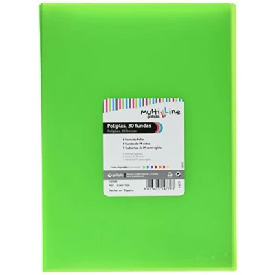 Folder with 30 clear pockets welded to the spine Translucent covers in green semi-rigid polypropylene with vertical stripes Foolscap Measurements: 31.5 x 21.5 cm 30 Extra Quality Polypropylene Clear Sleeves These portfolios are perfect for classifying your office, home or school documents