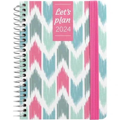 2024 Day to a Page Diary with Blurred Pink from the Grafoplás "Design" Series of Planners, Fabric Lined Hardcover with Green and Pink Arrows Print, Rounded Corners and Metallic Spiral Binding High durability: Made in Spain with fabric lined rigid cardboard covers with printed design and metallic silver spiral binding Pocket size: This small diary has an a6 size and measures 10.5 x 16.5 cm make it perfect to be able to carry it in any bag or backpack and have it at all times with you. Organization Day Page View: It has a page day organization, each business day has its own page so you can write down everything you need. On the weekend, Saturday and Sunday, they come a single page. Each page has a lined space and a time slot to take notes neatly on the 70g FSC certified white paper with 2-ink printing. Extras for your planning: You have a space for personal identification, three-year calendar, annual planning, list for your contacts, Santoral and titles in box languages: Spanish, Catalan, Galician and Basque.