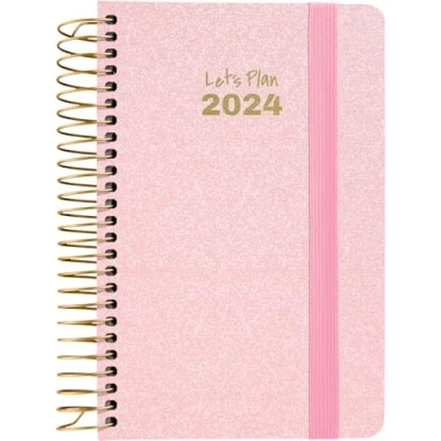 METALLIC DESIGN DIARY - 2024 Year Planner with Day to View, Hardcover Lined in Pastel Pink Metallic Fabric, Rounded Corners and Spiral Binding. High durability: Made in Spain with rigid cardboard covers lined with metallic fabric, metallic spiral binding in elegant gold color. Pocket size: This small diary has an a6 size and measures 10.5 x 16.5 cm make it perfect to be able to carry it in any bag or backpack and have it at all times with you. Daily organisation: Day view for working days and a sheet for Saturday and Sunday on 70g FSC certified white paper with 2-ink printing. Extras for your planning: You have a space for personal identification, three-year calendar, annual planning, list for your contacts, Santoral and titles in box languages: Spanish, Catalan, Galician and Basque.