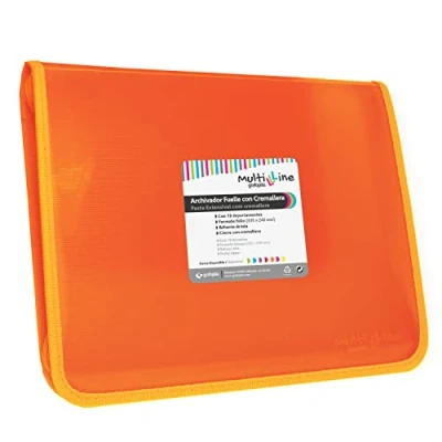 File folder with bellows made of polypropylene with vertical striping. Size Folio, 13 positions Orange with zip closure. With labels for vicessors: alphabet, months and customizable This folder is perfect for sorting and archiving all kinds of office, home or school documents
