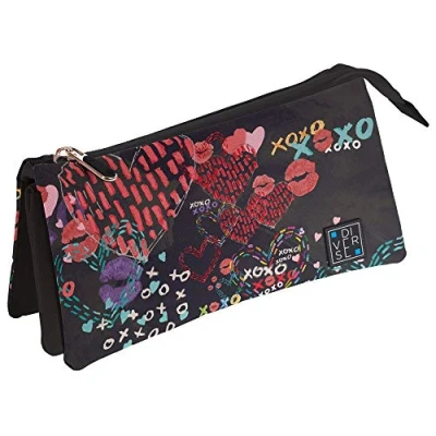 Dimensions: 23 x 12 x 14 cm. School pencil case with three compartments, 1 exterior zipper and 1 interior Portfolio Shape: Rectangular XOXO model, Diverse collection. Perfect for organizing your school or office supplies