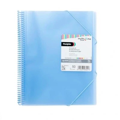 Grafoplás A4 Plastic Folder, Light Blue, 50 Extra Polypropylene Sleeves, Flexible Cover, Spiral Made of PVC, multiline Maxiplas, Perfect as School and Office Supplies