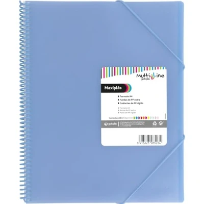 Folder with 20 transparent pockets made of extra quality polypropylene Flexible polypropylene caps with vertical stripes in pastel blue PVC spiral binding mechanism and elastic closure bands, the spiral allows for a 360 opening and closing make it perfect for taking anywhere A4 size Dimensions: 31.5 x 24 x 3 cm This file folder is the perfect ally for the classification and consultation of all types of documents: notes, invoices, fees, sheet music
