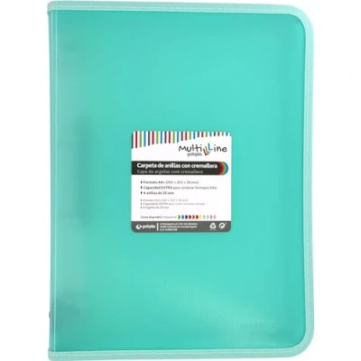 Total protection: 4 ring binder mixed 25 mm with zips and plastic covers Waterproof material: Made of translucent polypropylene with vertical striped mint green Large capacity: With a size A+ you can file documents both Dina4 and folio. Measurements: 26.5 x 35.5 x 3.8 cm COMPLETE COLLECTION: This ring binder is incorporated into the versatile "Multiline" collection of school supplies and stationery from Grafoplás Perfect for your classes: This ring binder is the ideal solution for attending your classes with all the documents you need, well protected from wrinkles, breaks or stains
