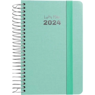 2024 Planner - 2024 Year Planner with Day to View, Hardcover Lined in Mint Green Fabric, Rounded Corners and Spiral Binding High durability: Made in Spain with rigid cardboard covers covered with fabric, metallic spiral binding in elegant gold colour. Pocket size: This small diary has an a6 size and measures 10.5 x 16.5 cm make it perfect to be able to carry it in any bag or backpack and have it at all times with you. Daily organisation: Day view for working days and a sheet for Saturday and Sunday on 70g FSC certified white paper with 2-ink printing. Extras for your planning: You have a space for personal identification, three-year calendar, annual planning, list for your contacts, Santoral and titles in box languages: Spanish, Catalan, Galician and Basque.