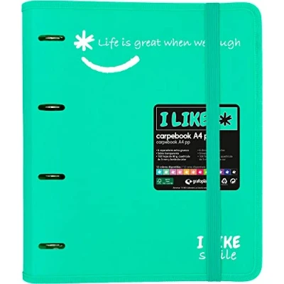 This ring binder contains 100 x 5 90g squared sheets, 6 dividers and a clear envelope 4 Mixed Ring Mechanism 35mm Large capacity Made of polypropylene, semi-rigid covers, opaque Ergonomic curved spine with 15 mm width, extremely durable Size: A4 Mint Green