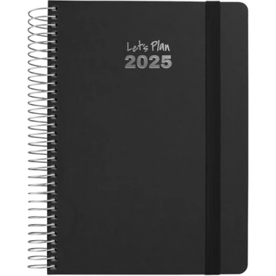 Grafoplas Diary 2025 Day Per Page Size 15 x 21 cm Fancy Black Spanish Spiral Hard Cover Lined Fabric Vertical Rubber Closure Rounded Corners Includes Stickers FSC Certified