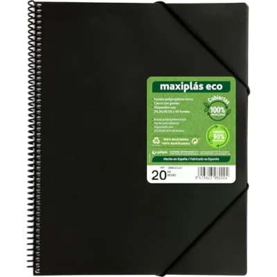 100% Recycled Materials: The flexible covers of this Maxiplás ECO folder with sleeves are made with 100% recycled polypropylene, promoting the care of the environment HIGH QUALITY TRANSPARENT COVERS - Includes 20 polypropylene sleeves, made with 90% recycled material, that protect and allow for easy viewing of documents. SECURE ELASTIC CLOSURE - This file folder is designed with a convenient elastic band closure that keeps your documents safe and organized. BONUS ENVELOPE INCLUDED - Comes with an extra envelope for storing loose documents, cards or important notes, offering more versatility and a convenient adhesive textile closure Multifunctional filing cabinet: Ideal for everyday use in offices, schools and home, facilitating efficient management. Store your notes, sheet music, bills and other important papers