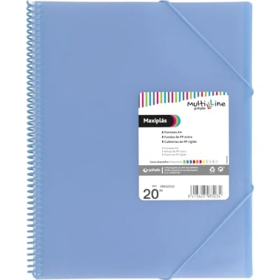 Folder with 20 transparent pockets made of extra quality polypropylene Flexible polypropylene caps with vertical stripes in pastel blue PVC spiral binding mechanism and elastic closure bands, the spiral allows for a 360 opening and closing make it perfect for taking anywhere A4 size Measurements: 31.5 x 24 x 2.8 cm This file folder is the perfect ally for the classification and consultation of all types of documents: notes, invoices, fees, sheet music