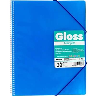 Blue covers in glossy rigid polypropylene Folder with pvc spiral mechanism Rubber closure Contains 30 extra glass perforated polypropylene covers Includes inside envelope with adhesive tape closure
