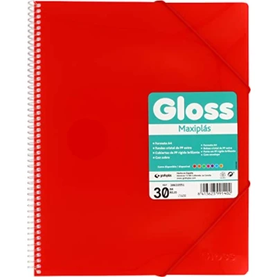 Red covers in glossy rigid polypropylene Folder with PVC spiral mechanism Rubber closure Contains 30 extra glass perforated polypropylene covers Includes inside envelope with adhesive tape closure
