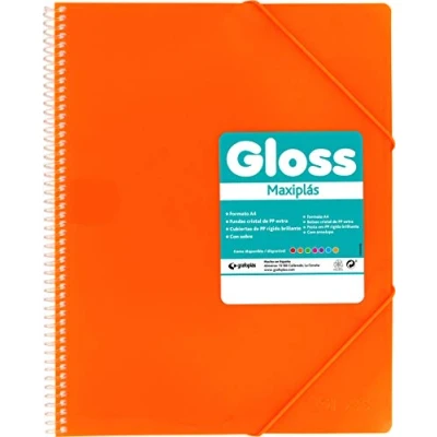 Orange covers in glossy rigid polypropylene Folder with PVC spiral mechanism Rubber closure Contains 50 extra glass perforated polypropylene covers Includes inside envelope with adhesive tape closure