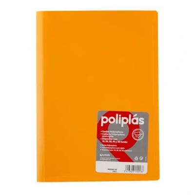 Description and Use: Grafoplás Polyplás Opaque folder, designed with 30 transparent pockets of standard quality, ideal for organising and protecting A4 documents. Material: Covers made of semi-rigid opaque polypropylene, offering durability and resistance suitable for everyday use and covers with standard quality polypropylene and finished in orange leather Design: Sleeves are welded to the spine, ensuring documents stay firmly in place without risk of falling or slipping. Origin: Product made in Spain, guaranteeing a quality standard and local production. COLOR & CAPACITY: Features an attractive tangerine color and has a capacity of 30 sleeves, offering enough space for organizing important papers and documents.