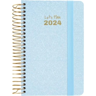 Metallic Planner - 2024 Year Planner with Day to View, Hardcover Lined in Pastel Blue Metallic Fabric, Rounded Corners and Spiral Binding. High durability: Made in Spain with rigid cardboard covers lined with metallic fabric, metallic spiral binding in elegant gold color. Pocket size: This small diary has an a6 size and measures 10.5 x 16.5 cm make it perfect to be able to carry it in any bag or backpack and have it at all times with you. Daily organisation: Day view for working days and a sheet for Saturday and Sunday on 70g FSC certified white paper with 2-ink printing. Extras for your planning: You have a space for personal identification, three-year calendar, annual planning, list for your contacts, Santoral and titles in box languages: Spanish, Catalan, Galician and Basque.