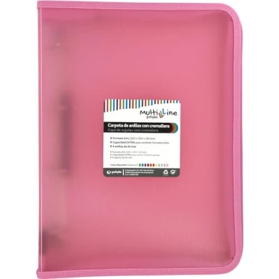 Total protection: 4 ring binder mixed 25 mm with zips and plastic covers Waterproof material: Made of translucent polypropylene with light pink vertical stripes Large capacity: With a size A+ you can file documents both Dina4 and folio. Measurements: 26.5 x 35.5 x 3.8 cm COMPLETE COLLECTION: This ring binder is incorporated into the versatile "Multiline" collection of school supplies and stationery from Grafoplás Perfect for your classes: This ring binder is the ideal solution for attending your classes with all the documents you need, well protected from wrinkles, breaks or stains