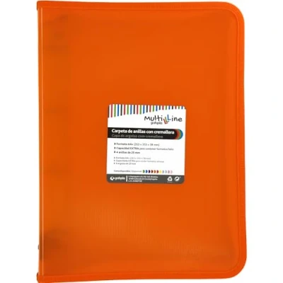Total protection: 4 ring binder mixed 25 mm with zips and plastic covers Waterproof material: Made of translucent polypropylene with orange vertical stripes Large capacity: With a size A+ you can file documents both Dina4 and folio. Measurements: 26.5 x 35.5 x 3.8 cm COMPLETE COLLECTION: This ring binder is incorporated into the versatile "Multiline" collection of school supplies and stationery from Grafoplás Perfect for your classes: This ring binder is the ideal solution for attending your classes with all the documents you need, well protected from wrinkles, breaks or stains