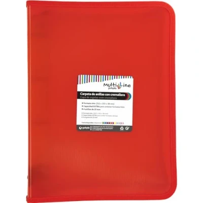 Total protection: 4 ring binder mixed 25 mm with zips and plastic covers Waterproof material: Made of translucent polypropylene with red vertical stripes Large capacity: With a size A+ you can file documents both Dina4 and folio. Measurements: 26.5 x 35.5 x 3.8 cm COMPLETE COLLECTION: This ring binder is incorporated into the versatile "Multiline" collection of school supplies and stationery from Grafoplás Perfect for your classes: This ring binder is the ideal solution for attending your classes with all the documents you need, well protected from wrinkles, breaks or stains