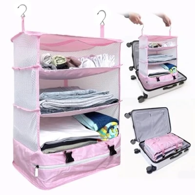 Grand Fusion Housewares Portable Luggage System Suitcase Organizer (Packable Hanging Travel Shelves & Packing Cube Organizer) Large Pink