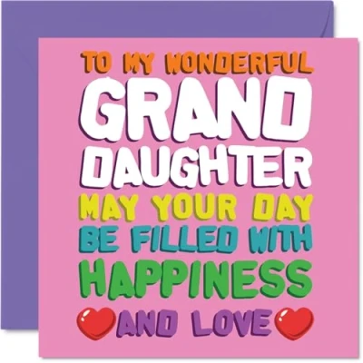 MAKE YOUR GRANDDAUGHTER SMILE WITH THIS UNIQUE BIRTHDAY CARD: This exceptional quality Granddaughter birthday card for her shows the design 'To my wonderful Granddaughter may your day be filled with happiness and love'. If you are looking for a beautiful birthday card Granddaughter for her, then then this happy birthday Granddaughter card is bound to make her smile. Not just a birthday card for Granddaughter this could also be a birthday gifts for Great Granddaughter or Step Granddaughter. WHAT DO YOU GET: The cards are printed on both sides with the inside print saying 'Have a Great Day' and ample space for your own personal message. The unique fun design is printed on a specially sourced and environmentally responsible board. At 360 microns thick the natural white one-sided gloss board has a quality look and feel. Supplied with a coloured gummed envelope to complement the design and ready to be sealed and sent in the post. NO INK SMUDGES: There is nothing worse than writing inside a card to find that the shiny surface makes the ink smudge. This is why we use a high quality one sided coated board. The uncoated side will absorb more of the ink from your pen to make smudging a thing of the past. Granddaughter birthday cards, Granddaughter birthday cards from Grandad. SIZES: Greeting Card = 145mm x 145mm, Envelope = 155mm x 155mm, Card Thickness = 360 micron. Happy birthday Granddaughter, Granddaughters birthday card, Granddaughter cards birthday, birthday card Granddaughter, happy birthday Granddaughter card, Granddaughter gifts from Grandad. MADE AND QUALITY CHECKED IN THE UK: We print and manufacture all our products right here in the UK so you can be sure of a fast turnaround and a product that is expertly made. Using environmentally responsible premium board our card is conscious of the responsible management of the world's forests - happy birthday card Granddaughter, Granddaughter birthday cards.