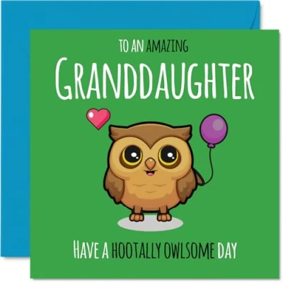 MAKE YOUR GRANDDAUGHTER SMILE WITH THIS UNIQUE BIRTHDAY CARD: This exceptional quality Granddaughter birthday card shows the design 'To An Amazing Granddaughter Have Hootally Owlsome Day'. If you are looking for an awesome birthday card for Granddaughter, then then this happy birthday Granddaughter card is bound to make them smile. Not just a birthday card for Granddaughter this could also be a birthday gifts for Granddaughter, Great Granddaughter or Step Granddaughter. WHAT DO YOU GET: The card is printed on one side and BLANK ON THE INSIDE to allow you to write your very own message. The unique fun design is printed on a specially sourced and environmentally responsible board. At 360 microns thick the natural white one-sided gloss board has a quality look and feel. Supplied with a coloured gummed envelope to complement the design and ready to be sealed and sent in the post. Great Granddaughter birthday cards, Great Granddaughter birthday card. NO INK SMUDGES: There is nothing worse than writing inside a card to find that the shiny surface makes the ink smudge. This is why we use a high quality one sided coated board. The uncoated side will absorb more of the ink from your pen to make smudging a thing of the past. Granddaughter birthday cards, Granddaughter birthday cards from Grandad. SIZES: Greeting Card = 145mm x 145mm, Envelope = 155mm x 155mm, Card Thickness = 360 micron. Happy birthday Granddaughter, Granddaughters birthday card, Granddaughter cards birthday, birthday card Granddaughter, happy birthday Granddaughter card, Granddaughter gifts from Grandad. MADE AND QUALITY CHECKED IN THE UK: We print and manufacture all our products right here in the UK so you can be sure of a fast turnaround and a product that is expertly made. Using environmentally responsible premium board our card is conscious of the responsible management of the world's forests - happy birthday card Granddaughter, Granddaughter birthday cards.