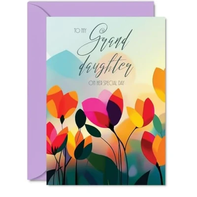 Dazzle your Granddaughter with joy using our exquisite Happy Birthday Card Granddaughter; a premium quality masterpiece that features a captivating design saying 'To My Granddaughter On Her Special Day'. The vibrant colours on this card make it stand out, ensuring it's not just a card but a beautiful keepsake. It's a Personal Gift that shows your Granddaughter how much you care and the perfect way to express your love and appreciation on her special day. What's Inside: Delve into a world of elegance with the inside print showcasing a lovely verse, 'May you have a fantastic day filled with joy, laughter and all the things...' as seen in the second image. There's ample space for your personal message. Crafted on a 360-micron thick environmentally responsible board, this one-sided gloss board offers a luxurious look and feel. Paired with a colored gummed envelope that complements the design, making it a truly special birthday gesture. Ink Perfection: Say goodbye to ink smudges! Our high-quality one-sided coated board ensures a smooth writing experience without the worry of smudging. The uncoated side absorbs ink, providing a flawless finish that adds to the card's overall premium quality. Granddaughter birthday cards, ladies birthday card, womens birthday card, Female birthday cards. Dimensions that Impress: Greet with grandeur using a card sized at 127mm x 178mm, accompanied by an envelope measuring 130mm x 180mm. The card boasts a thickness of 360 microns, ensuring a substantial and impressive presence. Granddaughter birthday card, happy birthday Granddaughter card, birthday card Female, summer birthday cards for women, birthday card flowers. British Craftsmanship: Proudly crafted and quality-checked in the UK, our birthday cards are a testament to expert design and manufacturing. Utilizing Forest Stewardship Council certified board, we contribute to responsible forest management. Expect a swift turnaround and a product that reflects the highest standards of quality. Granddaughter birthday cards, Female birthday cards adult, floral birthday card.